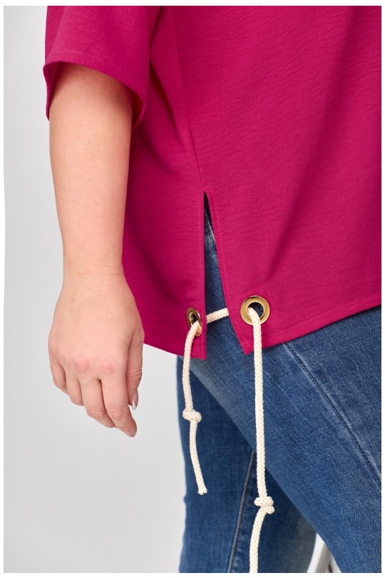 Эта блуза обладает всеми характеристиками стиля бохо: свободный силуэт, спущенная линия плеча и заниженная пройма, овальный вырез, рукав укороченный чуть за линию локтя и декоративные нашивки по переду. В боковых швах небольшие разрезы, по переду настрочены две декоративные нашивки, сверху справа и по низу с левой стороны, по низу переда и спинки ,рядом с разрезом расположены люверсы, через которые протянут декоративный шнур, вырез овальной формы, близкий к лодочке.