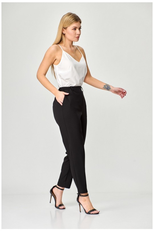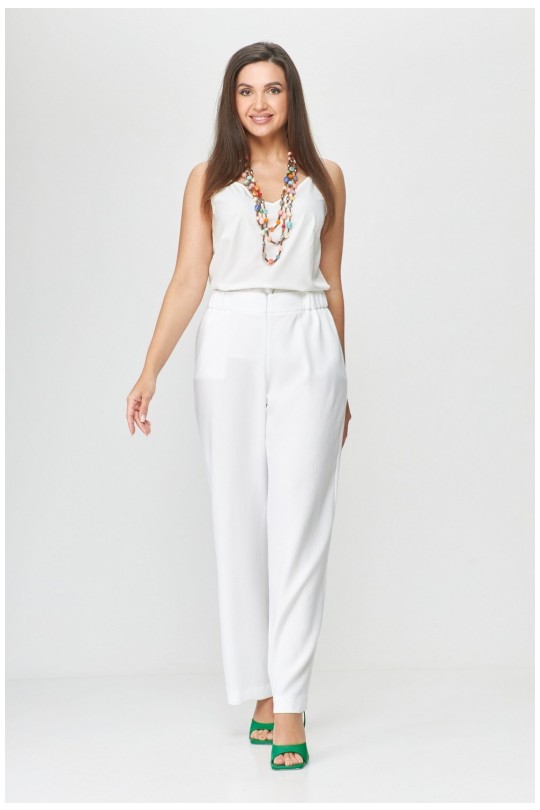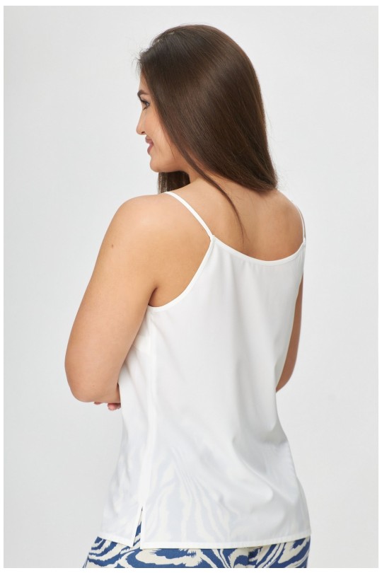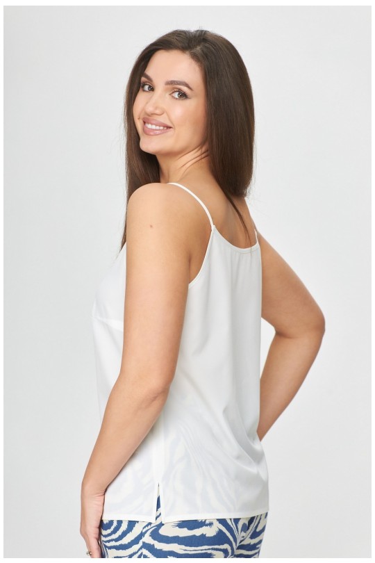 Этот топ выполнен из эластичной блузочной ткани, которая легко дышит и охлаждает, что делает его комфортным для жаркой погоды. Срезы горловины и проймы мягко окантованы, что придает топу нежный вид и обеспечивает дополнительный комфорт.