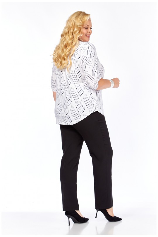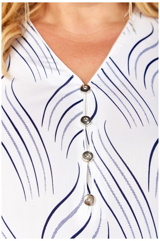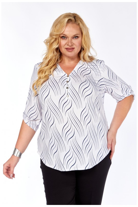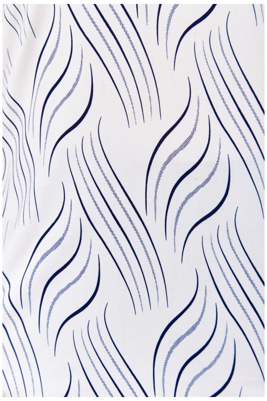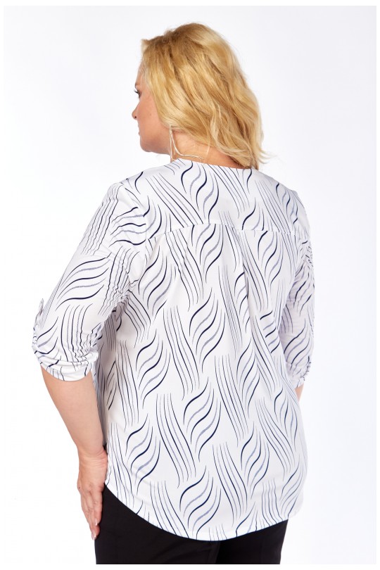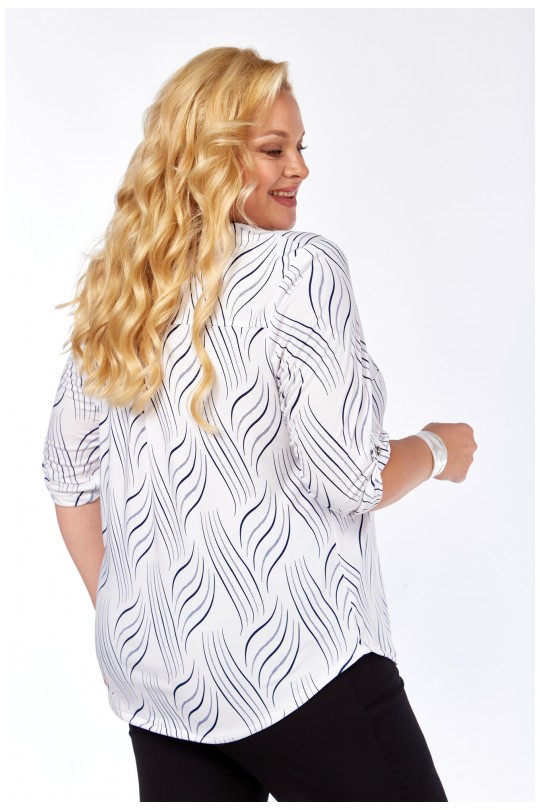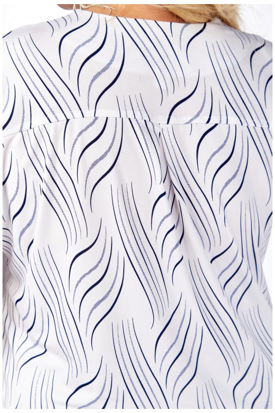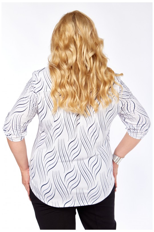Стильная блуза свободного кроя из лёгкого итальянского трикотажа «масло». Белая основа ткани украшена вертикальным волнистым принтом в тёмно-синей гамме — такой рисунок визуально вытягивает силуэт и придаёт фигуре лёгкость.