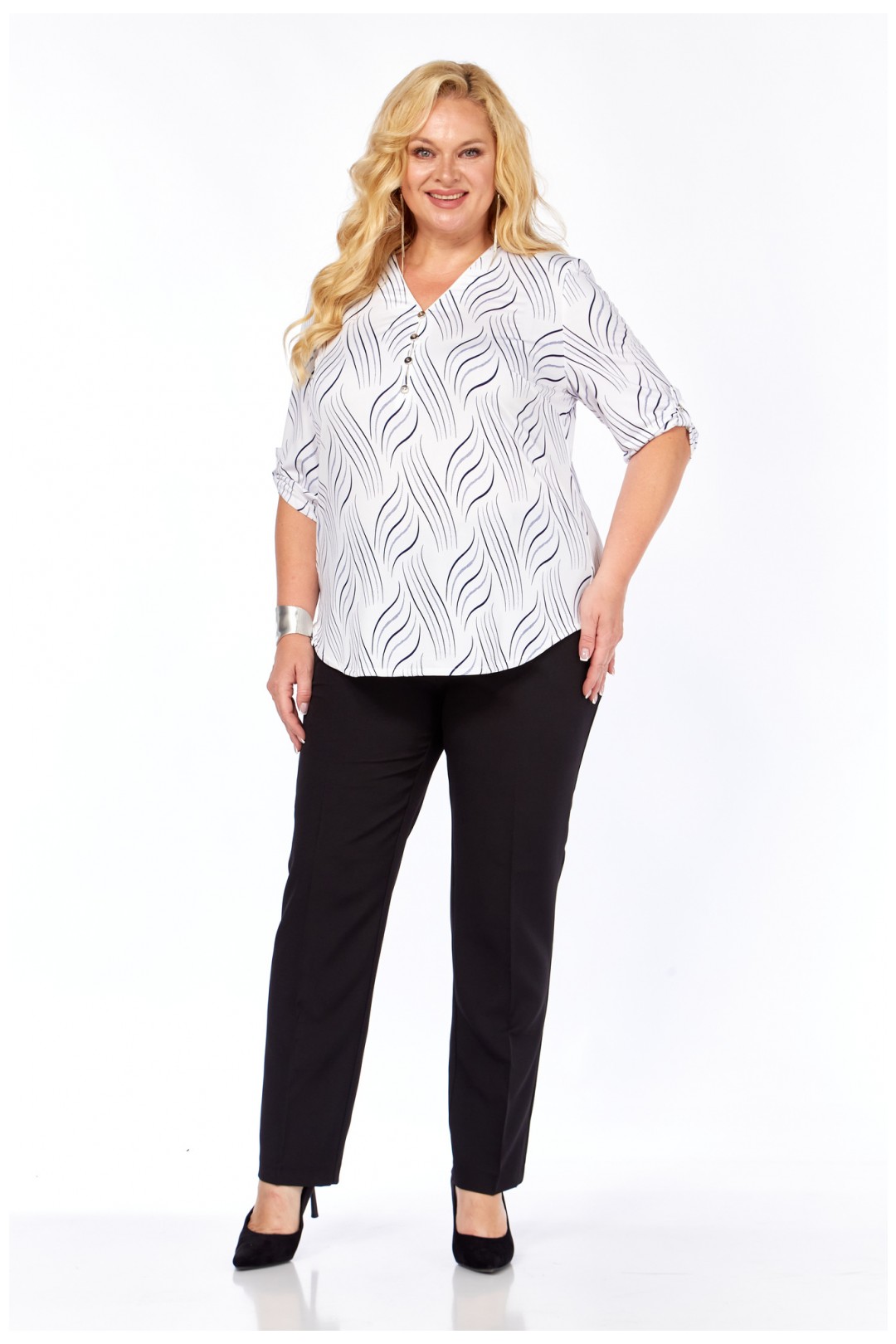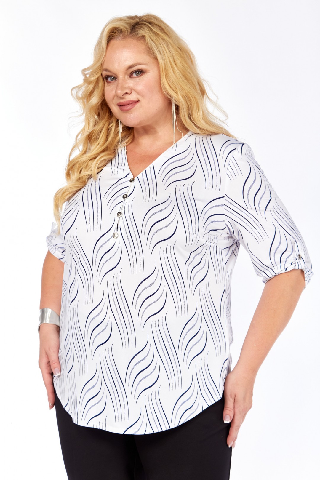 Рукава до локтя с изящными патами придают образу утончённость и позволяют регулировать стиль: от повседневного до более элегантного. Благодаря свободному крою и струящейся ткани блуза подходит женщинам с формами и легко вписывается как в офисный гардероб, так и в повседневные образы. Подплечники из мягкого тонкого поролона, что делает образ более стройным.