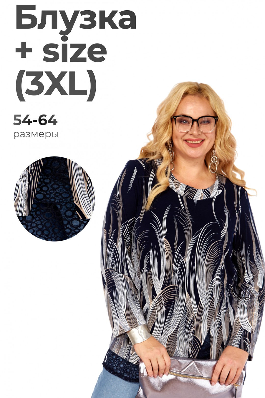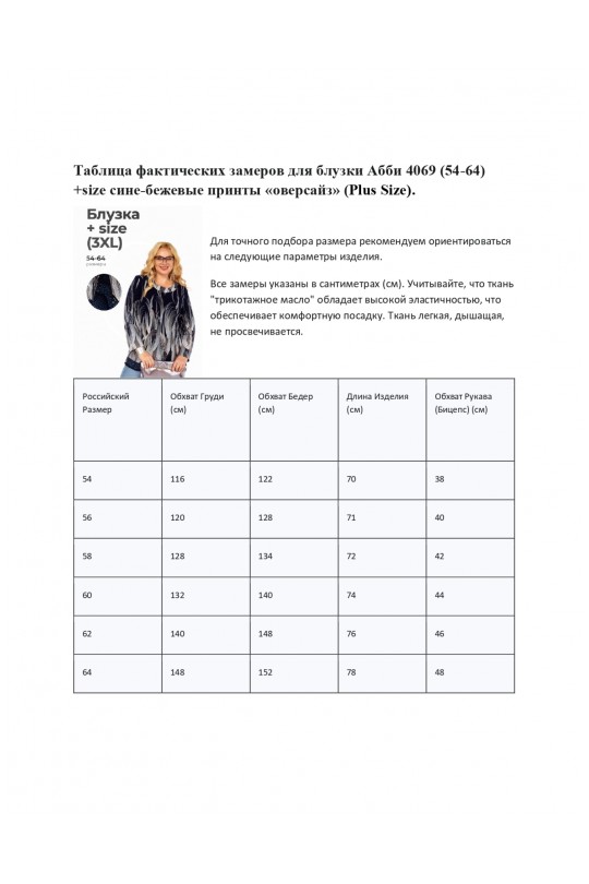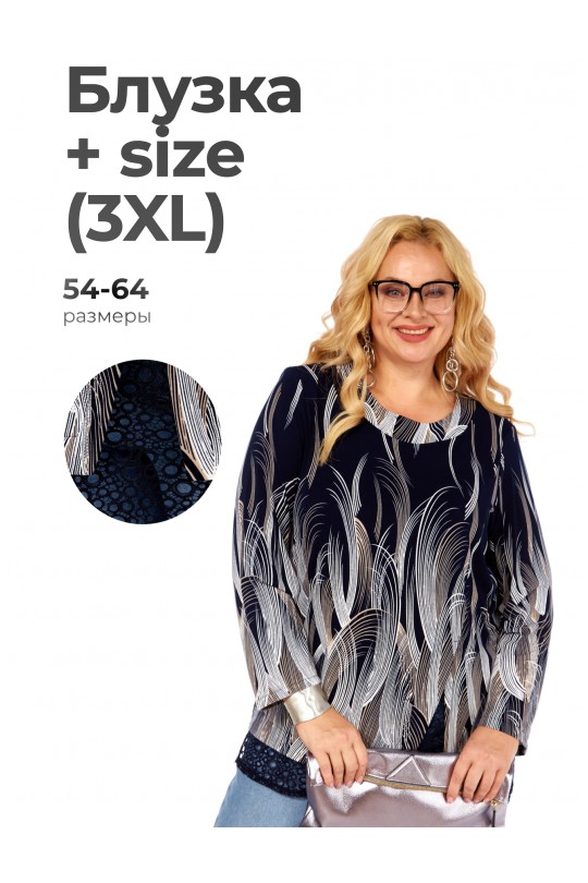 Модель имеет свободный крой оверсайз, который обеспечивает идеальную посадку на фигуру Plus Size (от 54 до 64), скрывая нежелательные объемы и гарантируя полную свободу движений. Блуза оснащена длинным втачным рукавом и классическим круглым вырезом горловины. Для дополнительного совершенства силуэта предусмотрены мягкие подплечники из тонкого поролона, которые аккуратно приподнимают линию плеч.