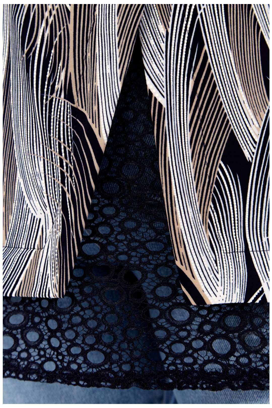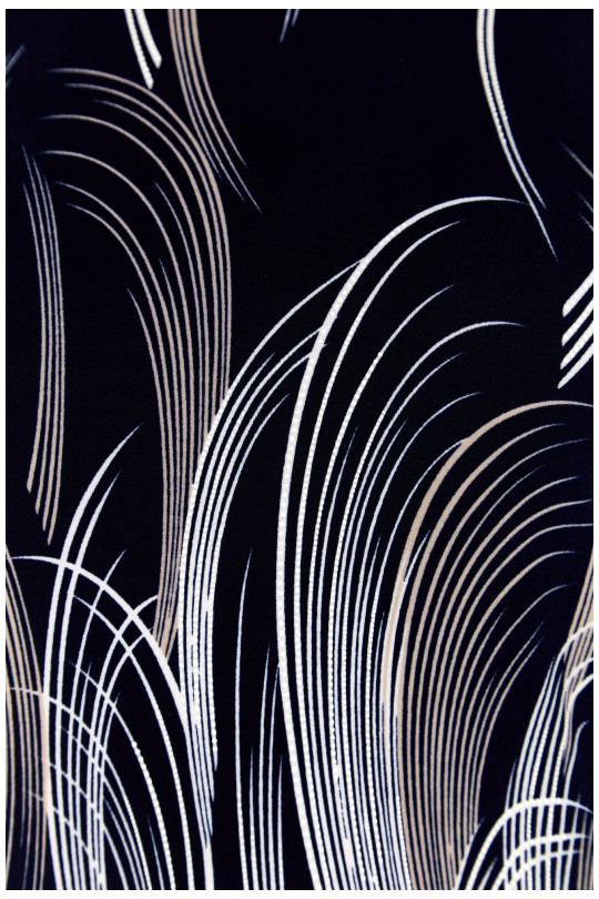 Насыщенный тёмно-синий фон выступает идеальной основой для динамичного графического принта. Узор представляет собой множество тонких, изогнутых вертикальных линий – своего рода "росчерков пера" или "космических траекторий". Цветовая палитра принта – изысканное сочетание белых, серебристо-серых и бежево-золотистых оттенков. Этот рисунок создаёт визуально вытягивающий и стройнящий эффект, придает образу выразительность и движение.