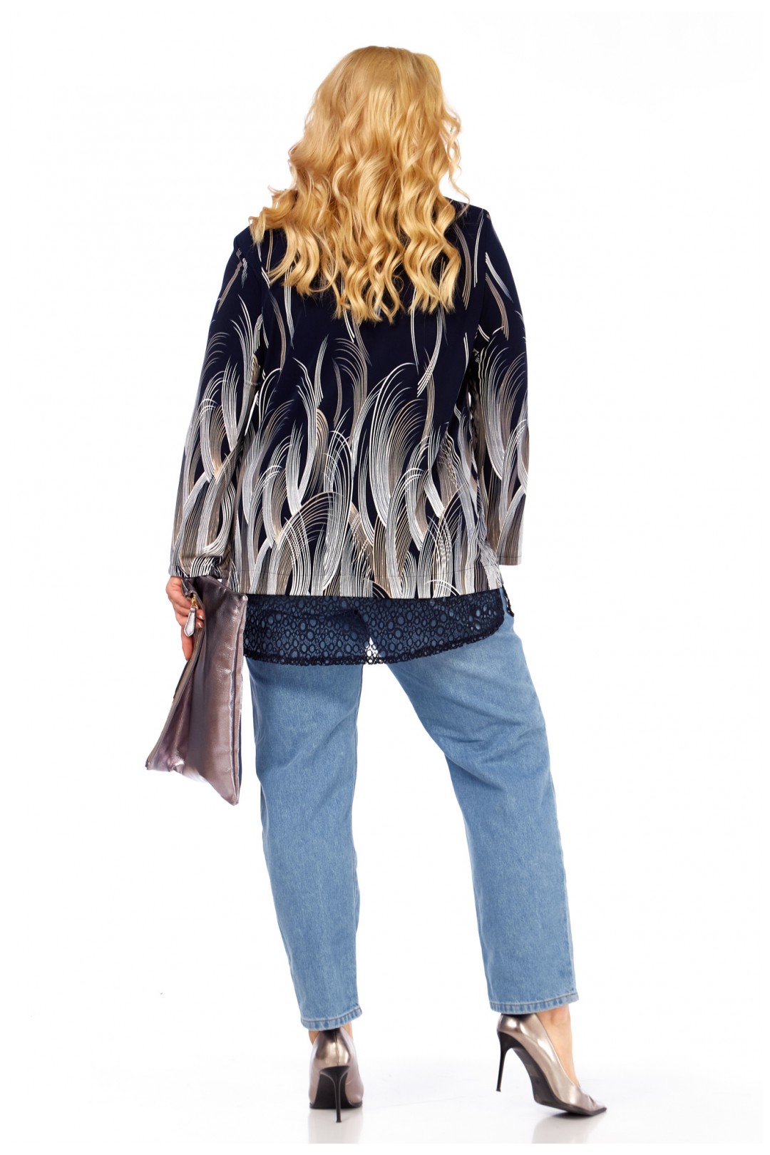 Эта блуза-туника идеально сочетается с джинсами, как на фото, а также с классическими брюками или леггинсами, становясь ключевым элементом гардероба для офиса, прогулок и встреч.