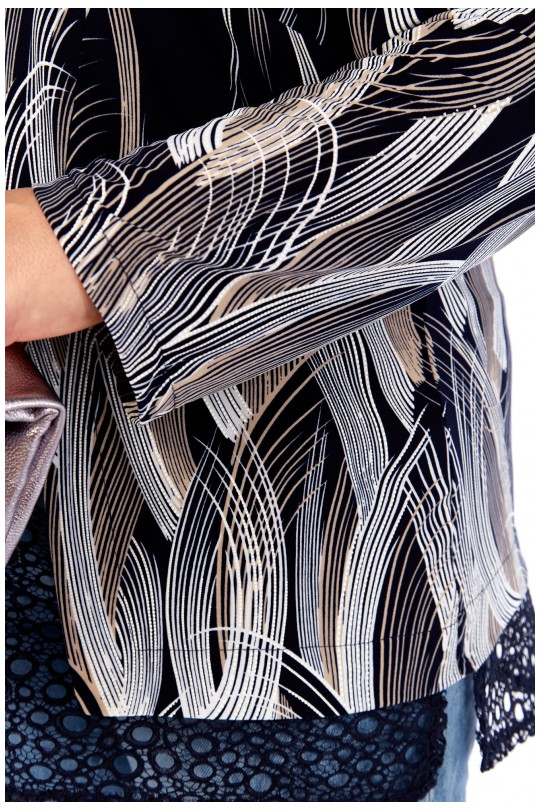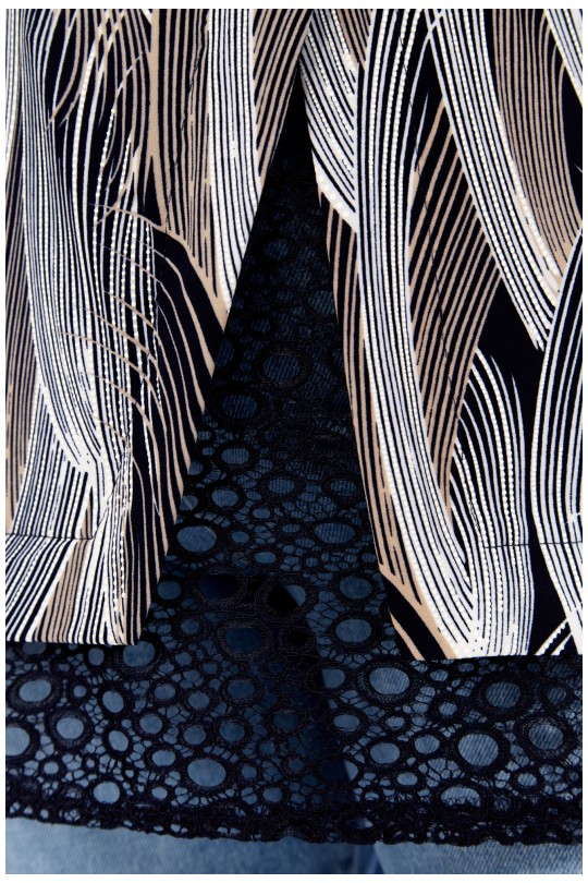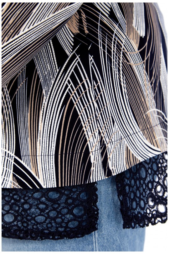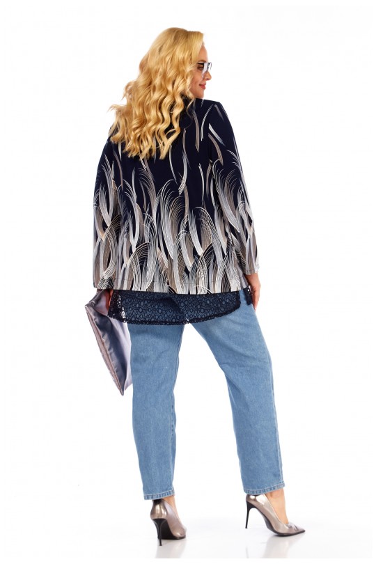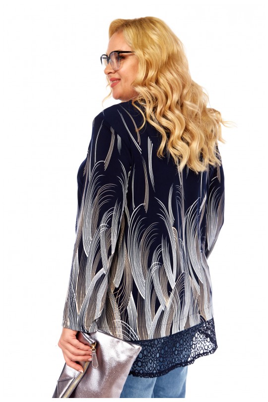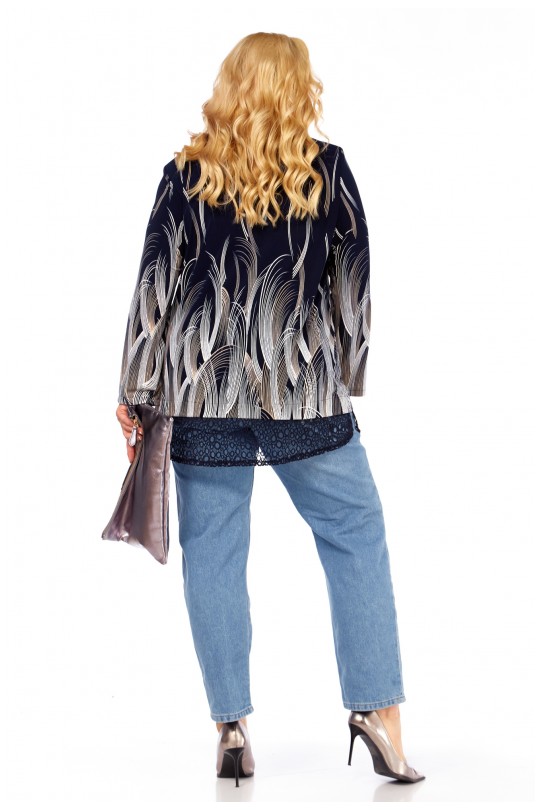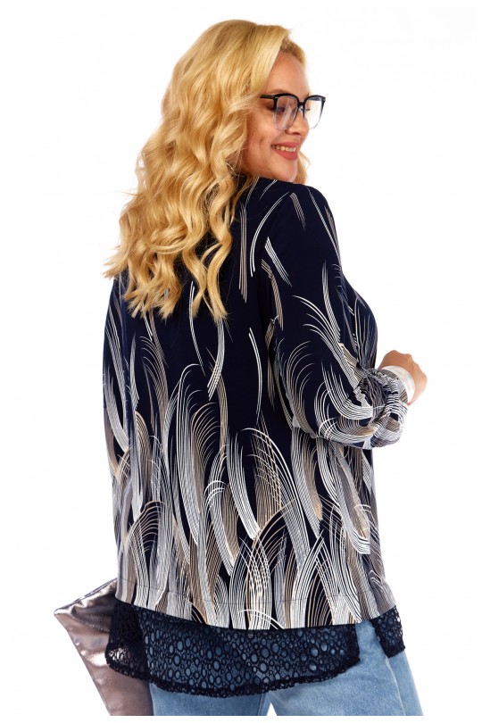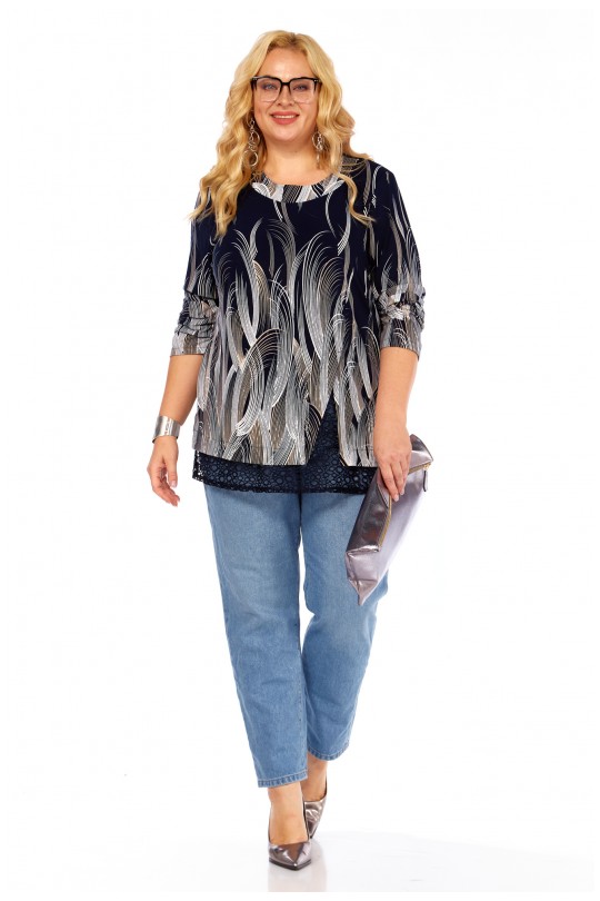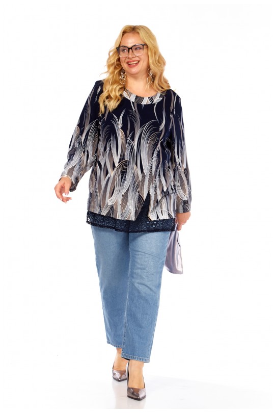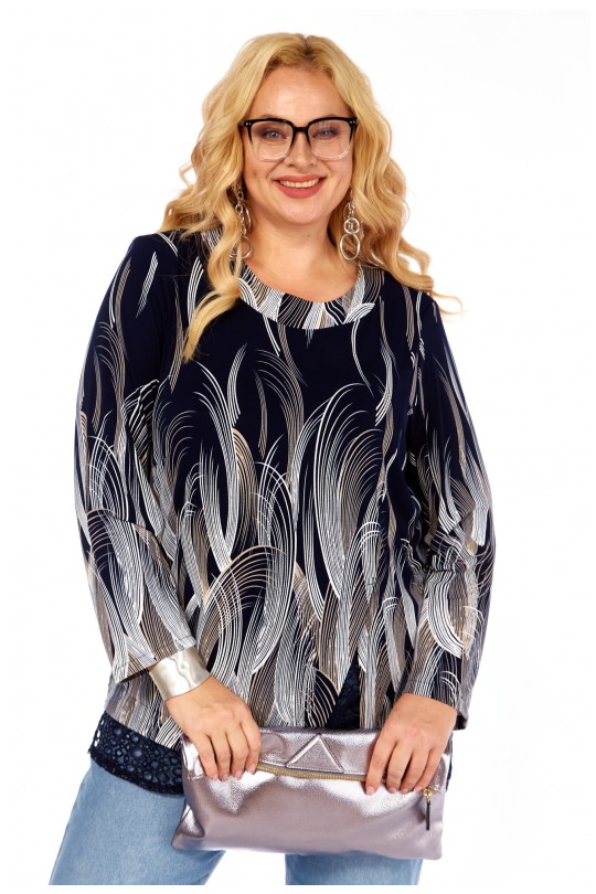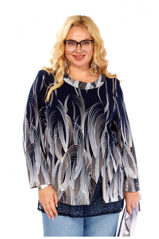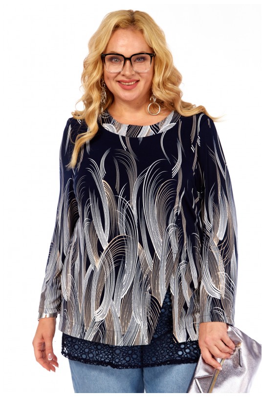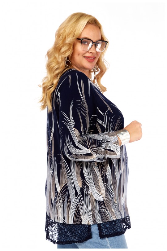 Блуза-туника – 4069 (р.54-64) темно-синие тона с динамичным графическим принтом и кружевом