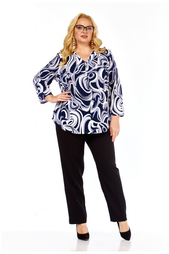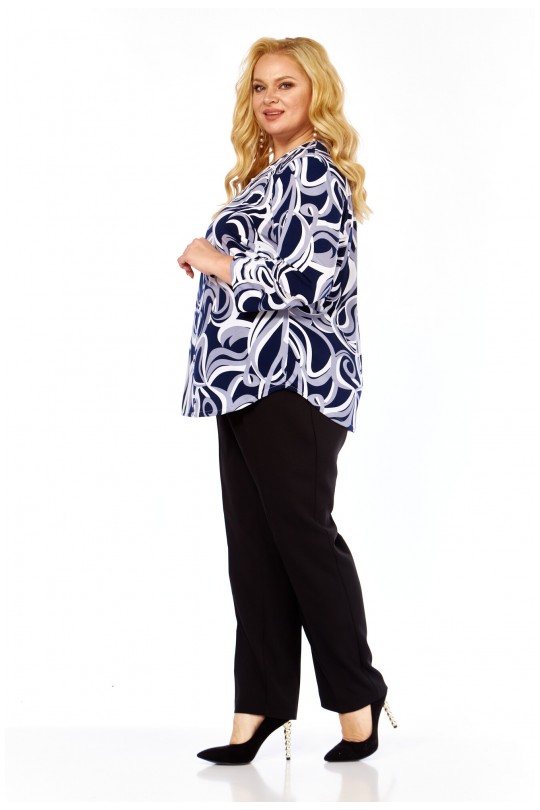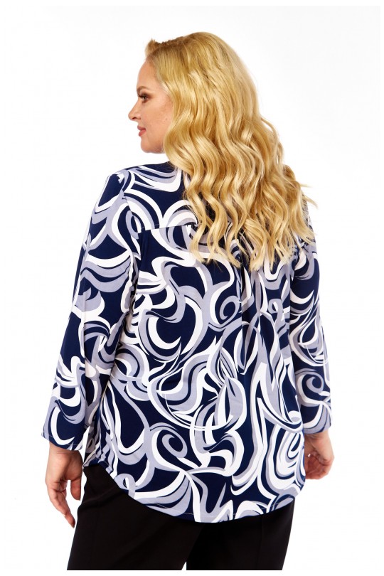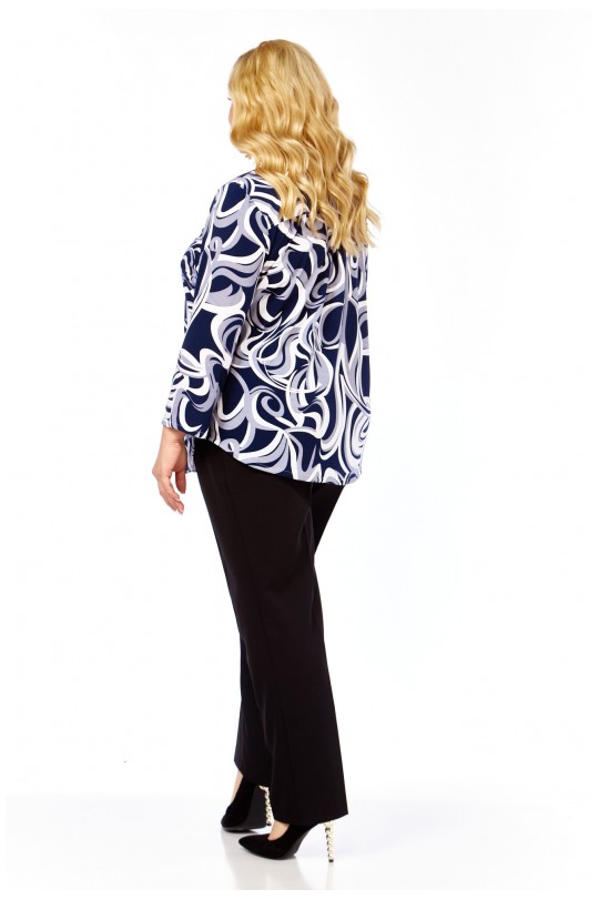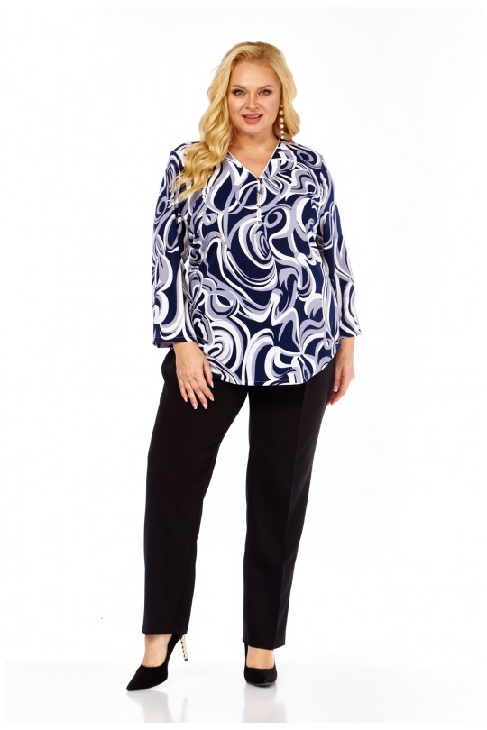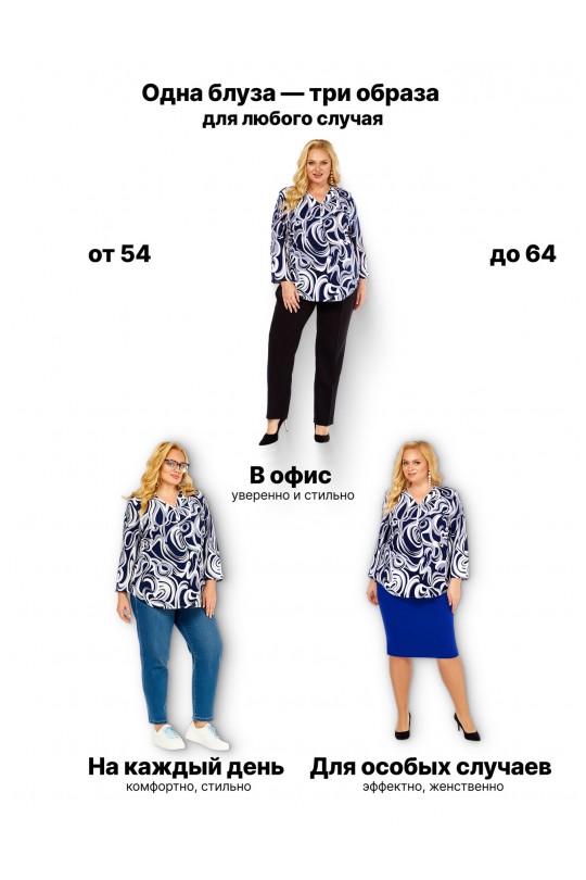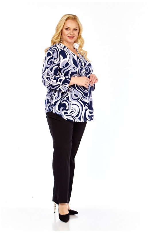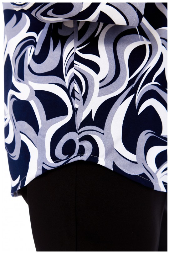 Динамичный сине-серо-белый принт с абстрактными мотивами моментально приковывает взгляд, стройнит силуэт и легко комбинируется как с классическими черными брюками, так и с юбками.