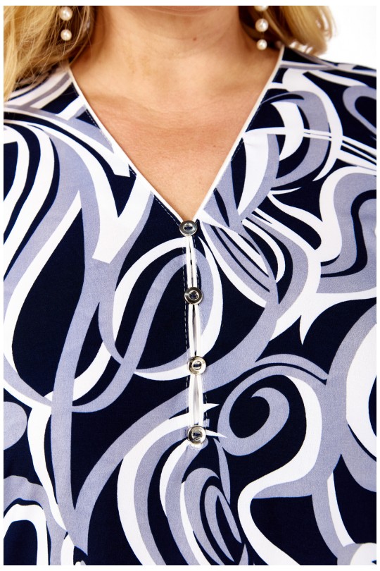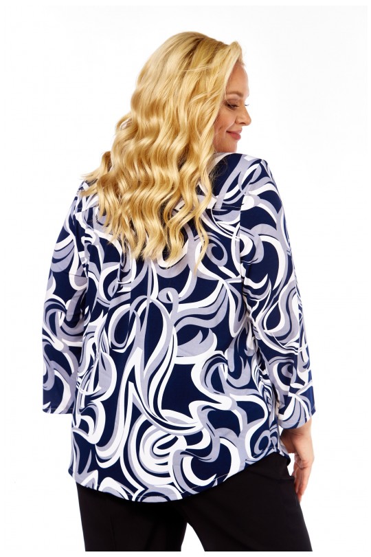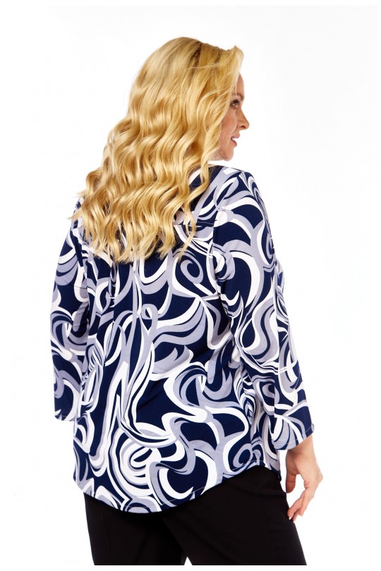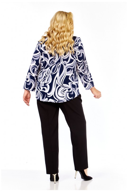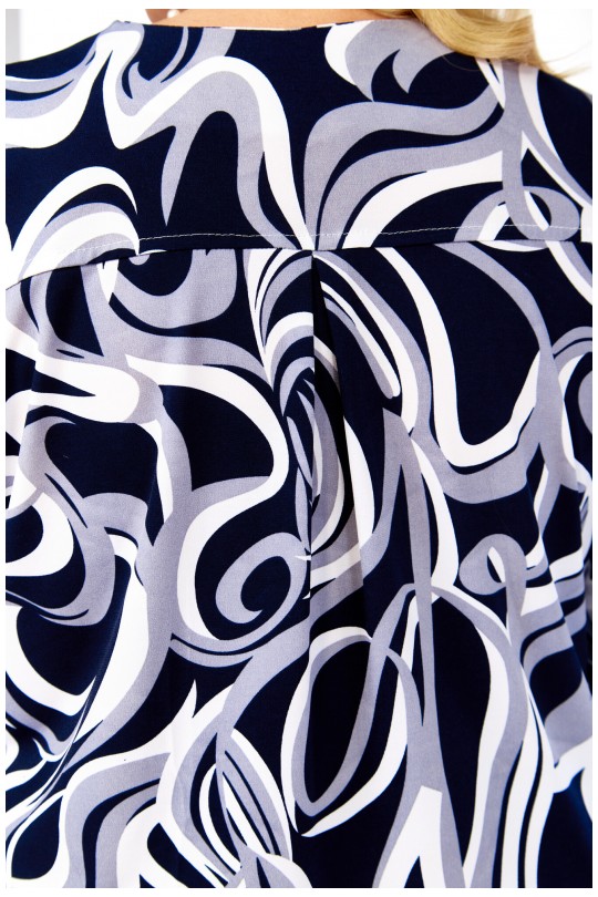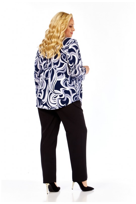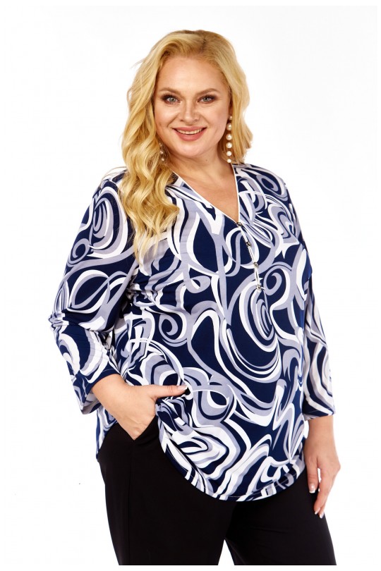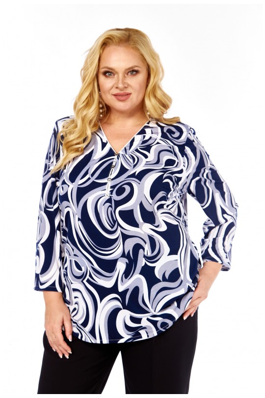 Динамичный сине-серо-белый принт с абстрактными мотивами моментально приковывает взгляд, стройнит силуэт и легко комбинируется как с классическими черными брюками, так и с юбками.