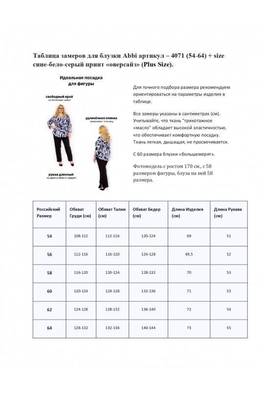 Уважаемые покупательницы, обратите внимание на то, что начиная с 60-го размера, блузки могут немного «большемерить». Это обеспечивает дополнительный комфорт и свободу облегания. Сама ткань эластична и хорошо тянется.