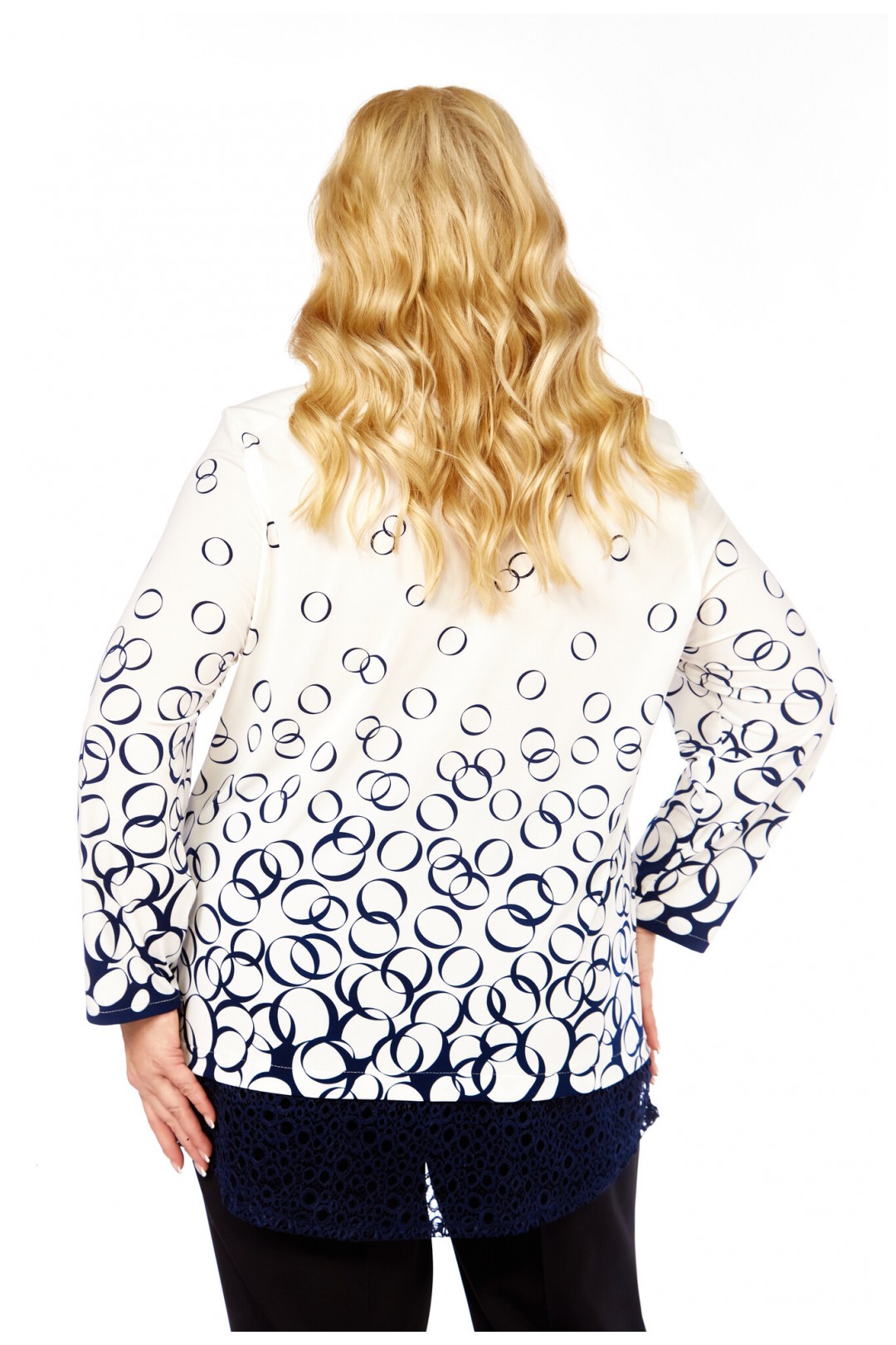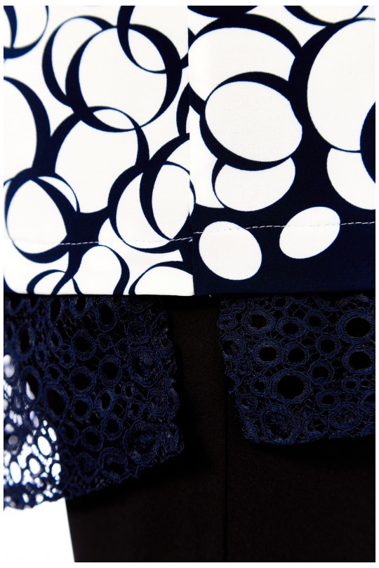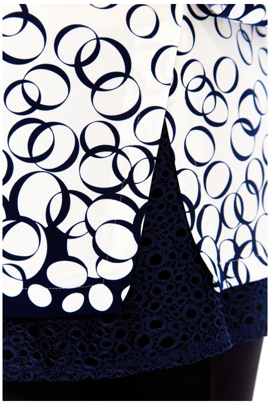 Особое внимание заслуживает нижний край: он оформлен асимметричной кружевной отделкой темно-синего цвета, которая придает изделию романтичности и шика. Благодаря разрезам по бокам, блуза не только выглядит стильно, но и обеспечивает максимальную свободу движений. Силуэт — свободный, объемный, идеально скрывающий недостатки и подчеркивающий достоинства фигуры.