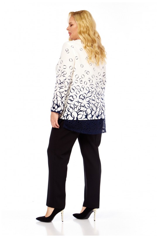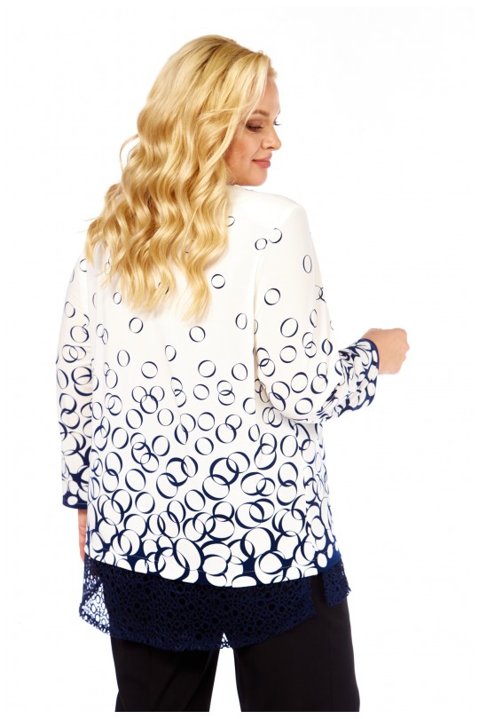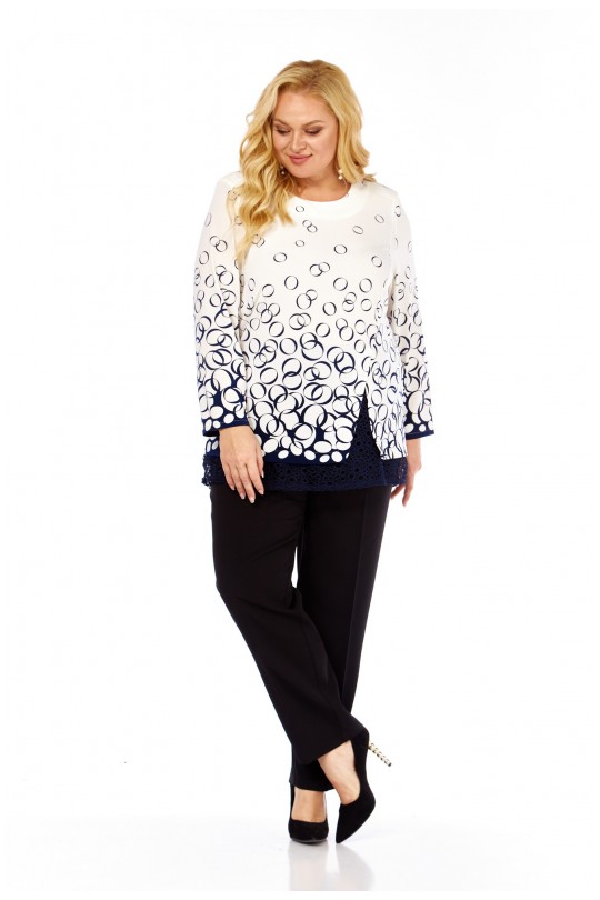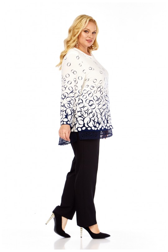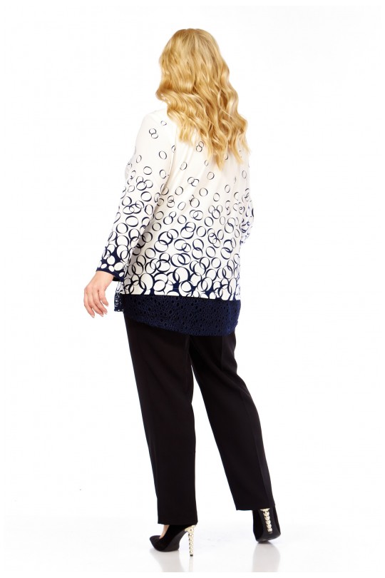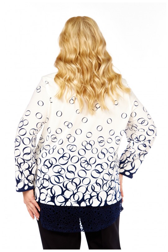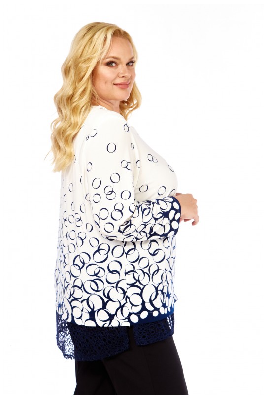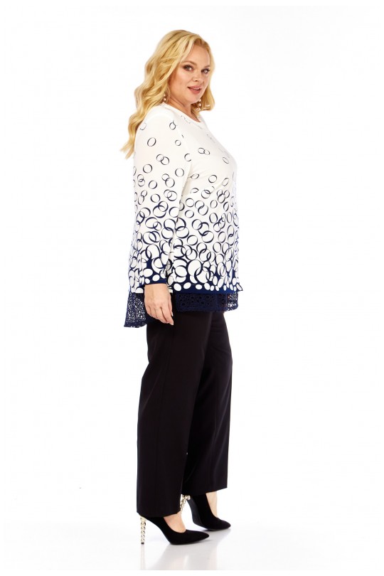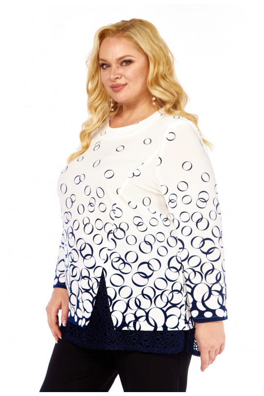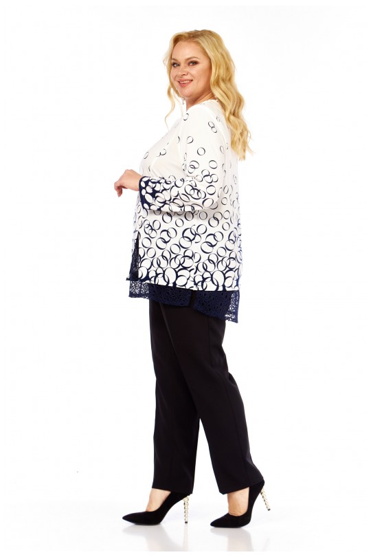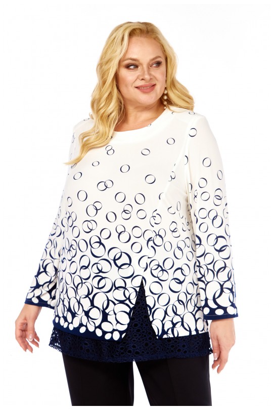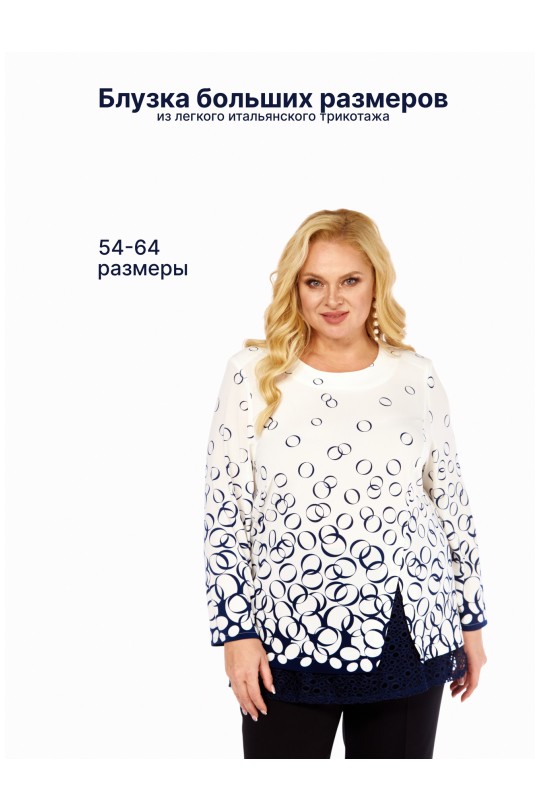 Блузка от «Абби Стиль» с артикулом 4073 и размерами от 54 до 64 в сине-белых тонах с отделкой кружевом — элегантность и комфорт для женщин с пышными формами.