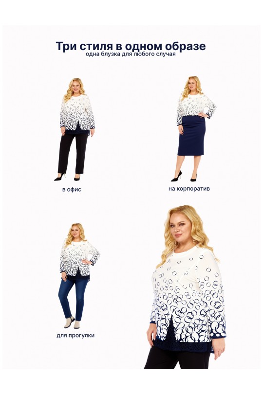 Блузка выполнена в белом цвете с эффектным принтом из насыщенных синих переплетающихся колец — современный, динамичный и очень запоминающийся узор. Контраст белого и глубокого синего создает визуально легкий и свежий образ, который легко вписывается как в офисный, так и в повседневный гардероб.