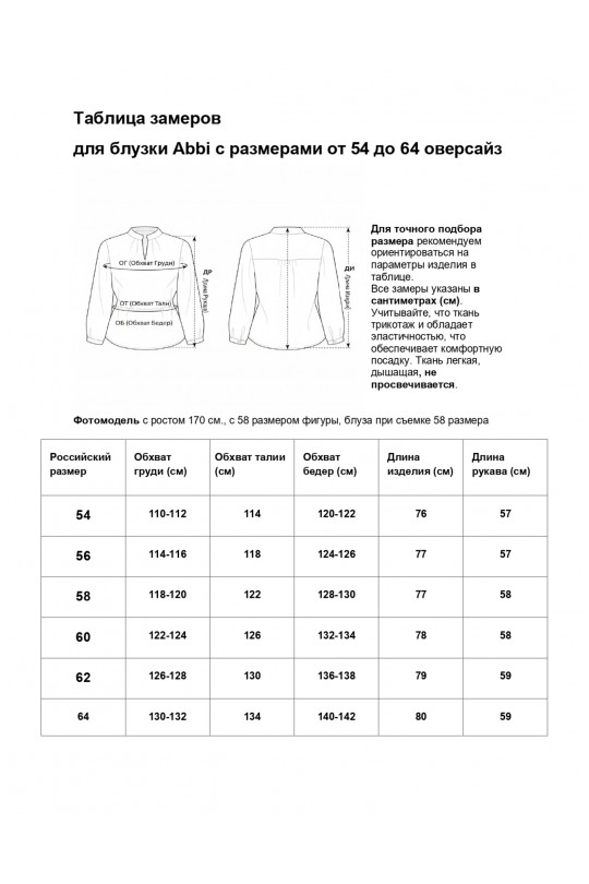 Фотомодель ростом 170 см, с размером фигуры 56–58, демонстрирует посадку блузки с размером 58, которая красиво лежит на фигуре, подчеркивая линии тела и создавая гармоничный силуэт.