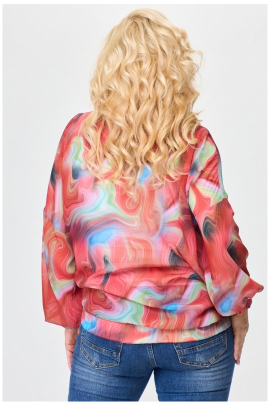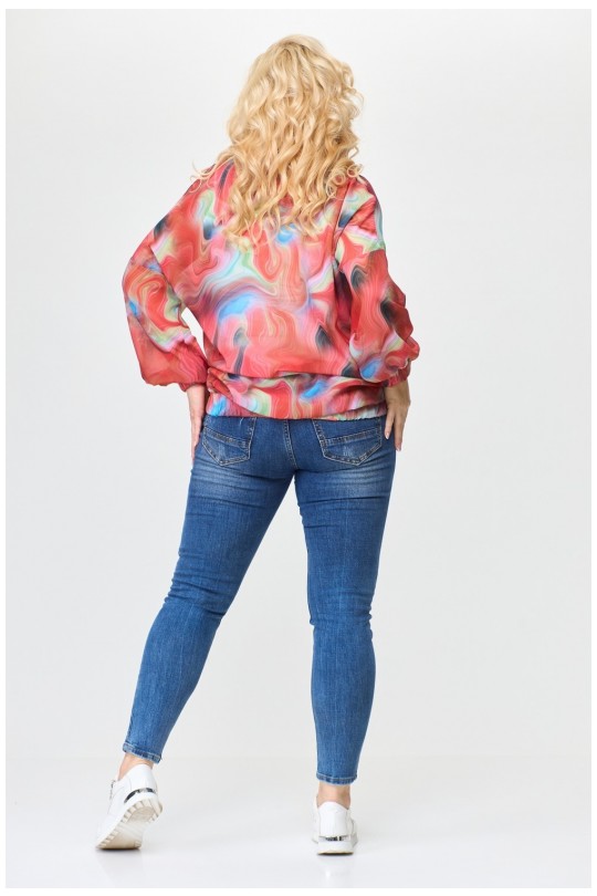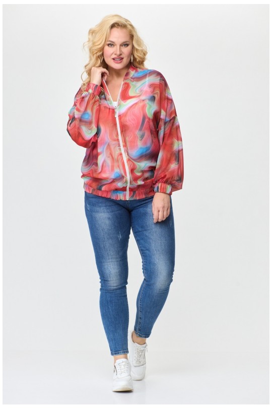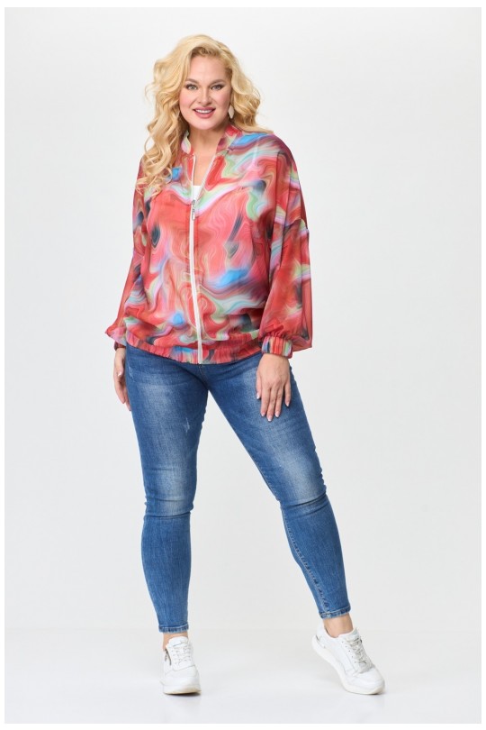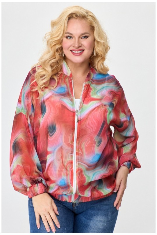 Выполнен из легкого дышащего шифона. Спущенная линия плеча и проймы, свободный одношовный длинный рукав, заканчивающийся манжетом, собранным в резинку, создают удобство и легкость в носке. По переду два прорезных кармана с листочками добавляют функциональности и удобства. Воротник стойка выглядит элегантно и стильно. Застежка однобортная прямая на декоративную тесьму молнию (трактор). По низу сборка на резинку - это модный акцент современной женской моды. Жакет-бомбер макси.