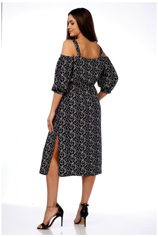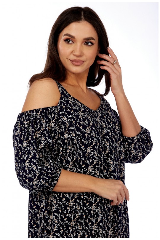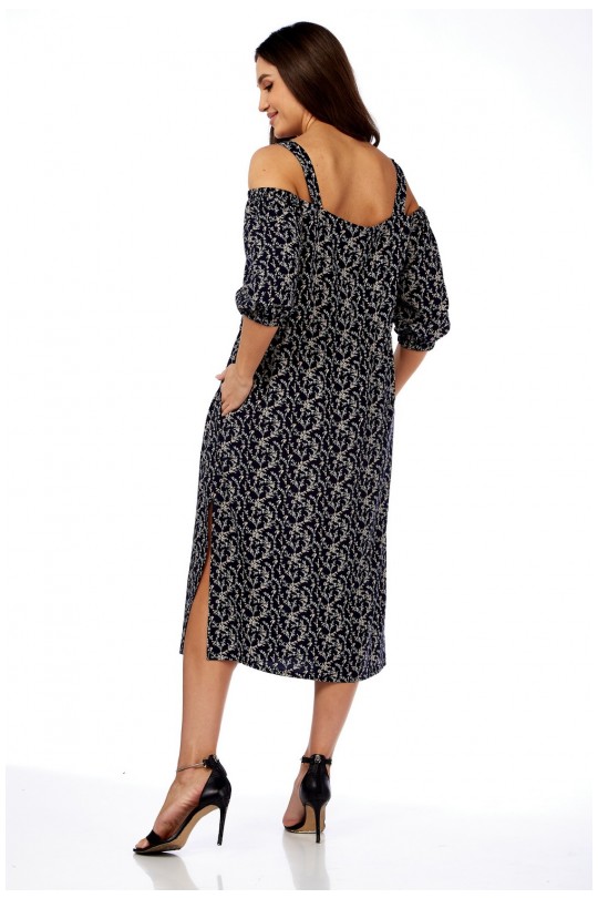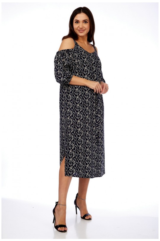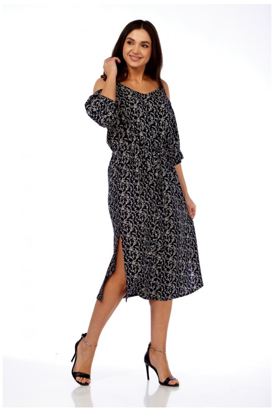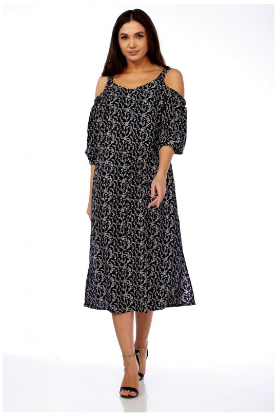 Платье женское полуприлегающего силуэта, чуть расширенное к низу, длиной ниже колена. По переду фигурный вырез подчеркивающий грудь. Верх платья на бретели со спущенным рукавом.