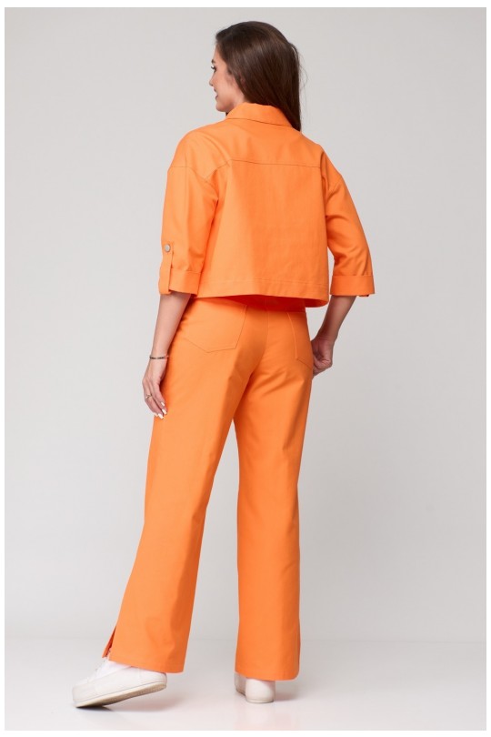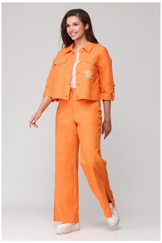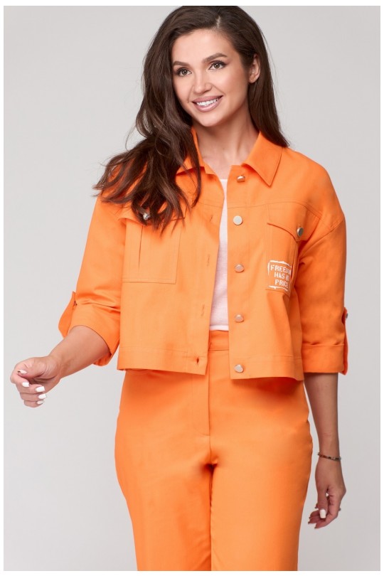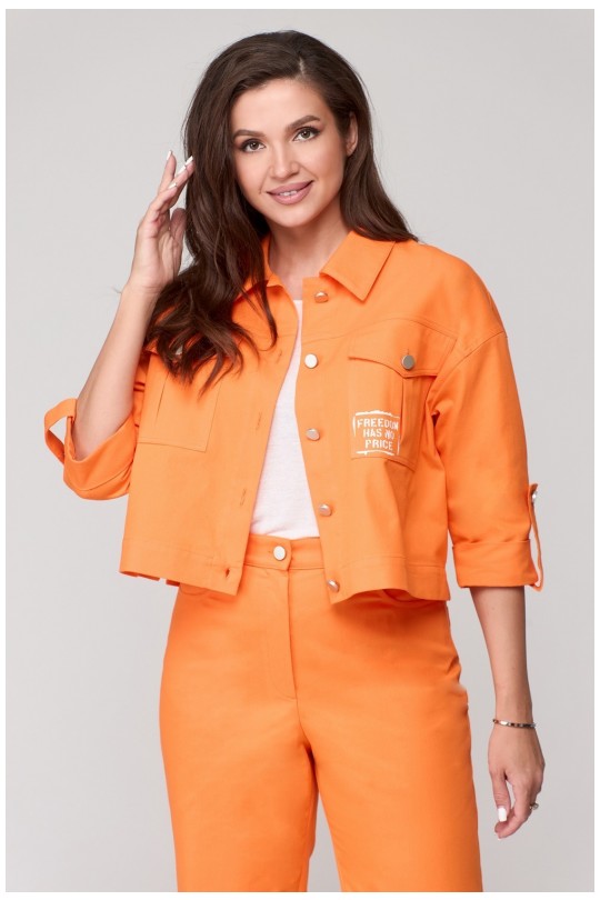 Перед с отрезной кокеткой, к которой расположен клапан. По переду под клапаном расположен накладной карман со встречной складкой по центру. На клапане расположена петля, на кармане пуговица. Стильный клапан на передней части жакета и накладной карман подчеркнут ваш неповторимый стиль, а оборотный воротник добавит нотку элегантности вашему образу. В то же время, рукава рубашечного кроя и 3/4 длины обеспечат комфорт при ношении, а отделочные строчки добавят изысканности